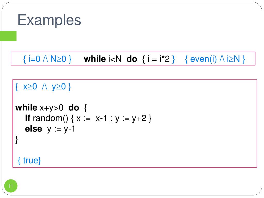 Examples { i=0 /\ N0} whilei<N do { i = i*2 } { even(i) /\ iN } { x0 /\ y0 } whilex+y>0 do{ if random() { x := x-1 ; y := y+2 } else y := y-1 } { true}