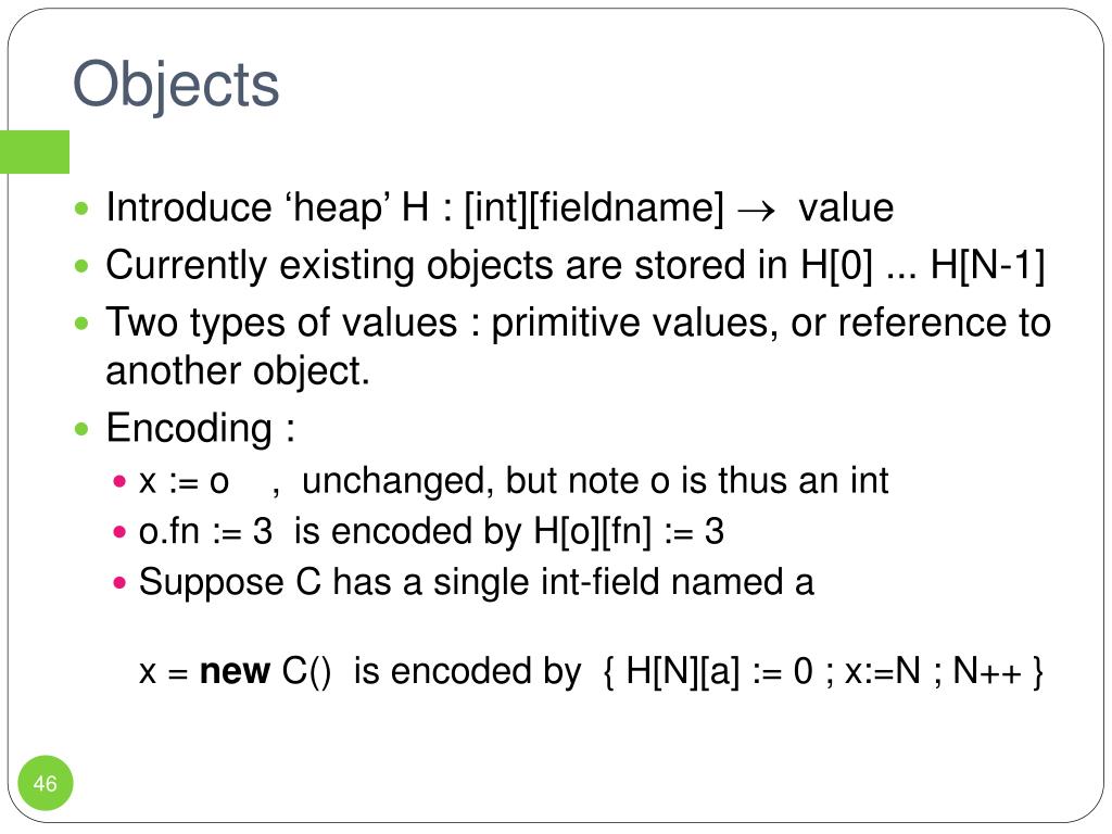 Objects • Introduce ‘heap’ H : [int][fieldname] value • Currently existing objects are stored in H[0] ... H[N-1] • Two types of values : primitive values, or reference to another object. • Encoding : • x := o , unchanged, but note o is thus an int • o.fn := 3 is encoded by H[o][fn] := 3 • Suppose C has a single int-field named a x = new C() is encoded by { H[N][a] := 0 ; x:=N ; N++ }
