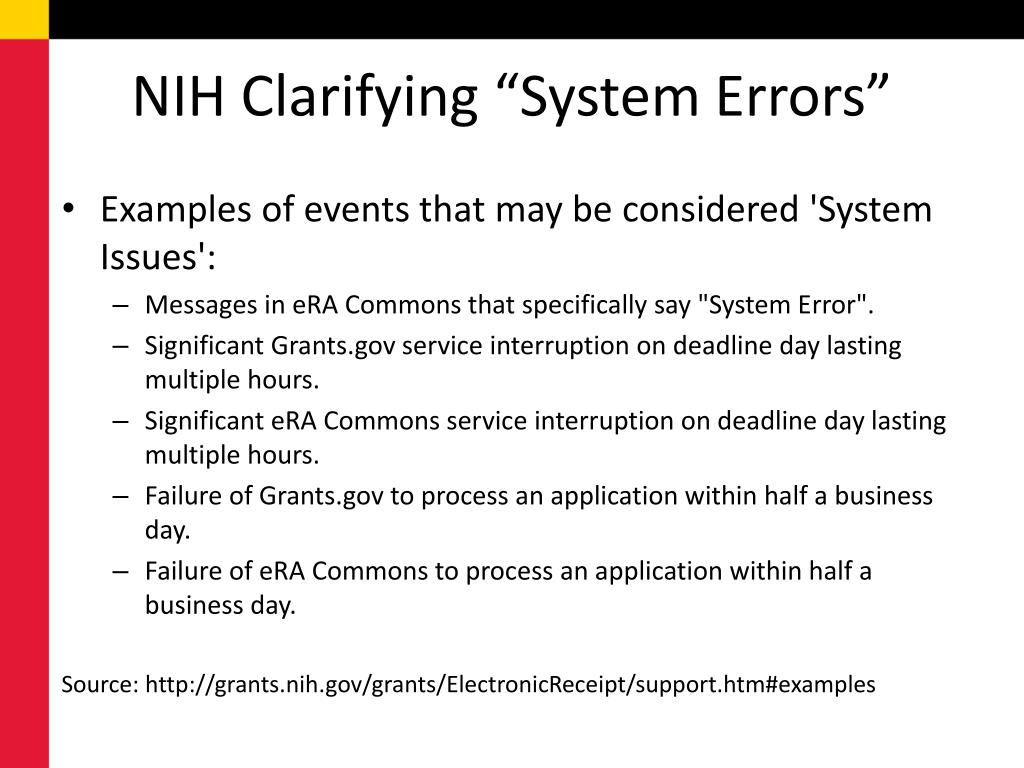 NIH Clarifying “System Errors” • Examples of events that may be considered 'System Issues': • Messages in eRA Commons that specifically say "System Error". • Significant Grants.gov service interruption on deadline day lasting multiple hours. • Significant eRA Commons service interruption on deadline day lasting multiple hours. • Failure of Grants.gov to process an application within half a business day. • Failure of eRA Commons to process an application within half a business day. Source: http://grants.nih.gov/grants/ElectronicReceipt/support.htm#examples
