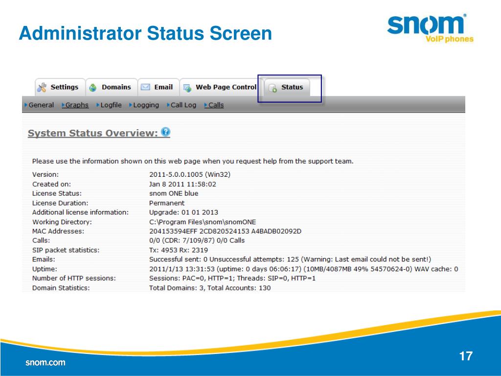 Status Tab—Logfile • Contains full SIP traces and other events • Easy to filter • Can be saved to file • Date and time • Type of packet • Rx = received • Tx = transmitted • Tr = transmitted the same response again • Transport type • IP address and port the packet was received or sent to Log event is in brackets [ ]