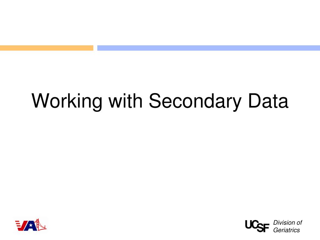 Learning objectives • Appreciate key conceptual and methodologic issues involved in outcomes research employing secondary data analysis • Identify and use online tools for locating and learning about datasets relevant to your research • Understand the range of resources and support required to successfully complete a secondary data analysis