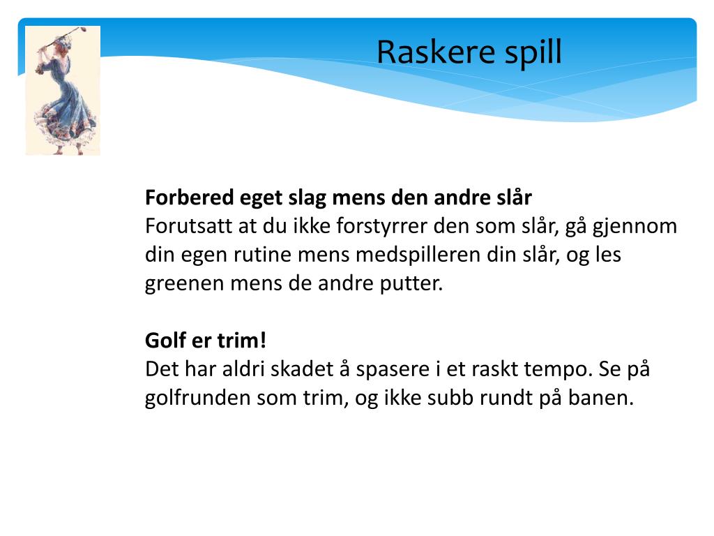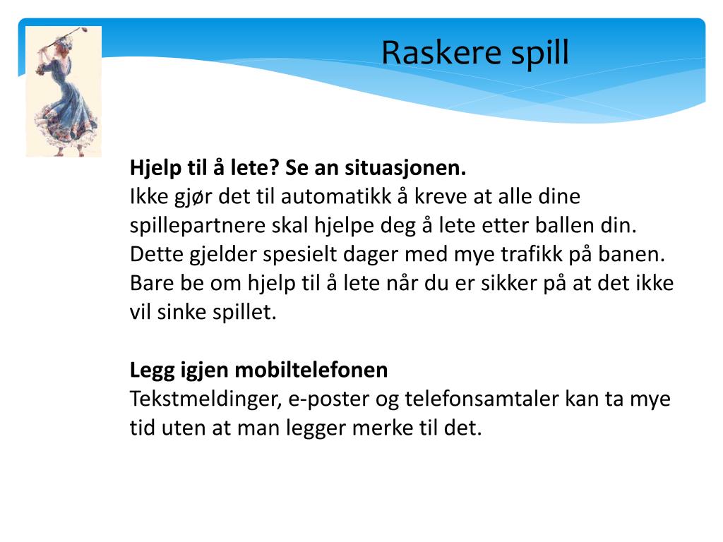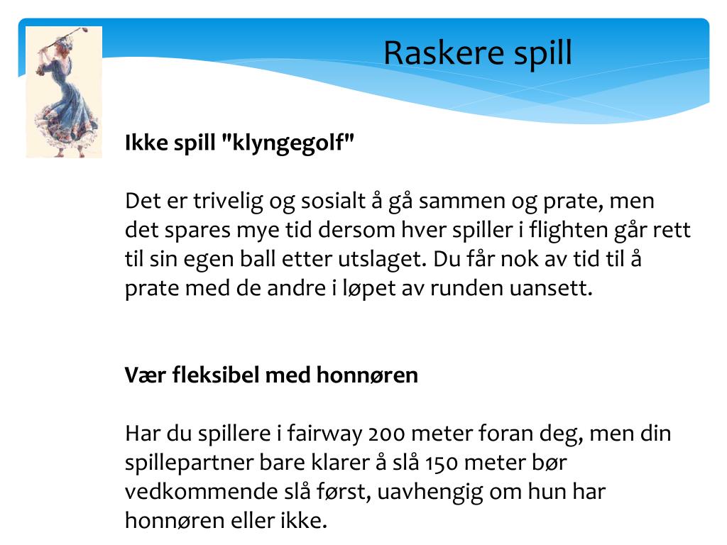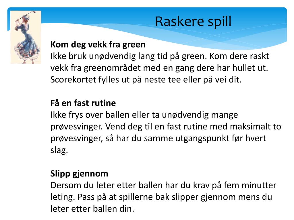 Raskere spill Kom deg vekk fra green Ikke bruk unødvendig lang tid på green. Kom dere raskt vekk fra greenområdet med en gang dere har hullet ut. Scorekortet fylles ut på neste tee eller på vei dit. Få en fast rutine Ikke frys over ballen eller ta unødvendig mange prøvesvinger. Vend deg til en fast rutine med maksimalt to prøvesvinger, så har du samme utgangspunkt før hvert slag. Slipp gjennom Dersom du leter etter ballen har du krav på fem minutter leting. Pass på at spillerne bak slipper gjennom mens du leter etter ballen din.