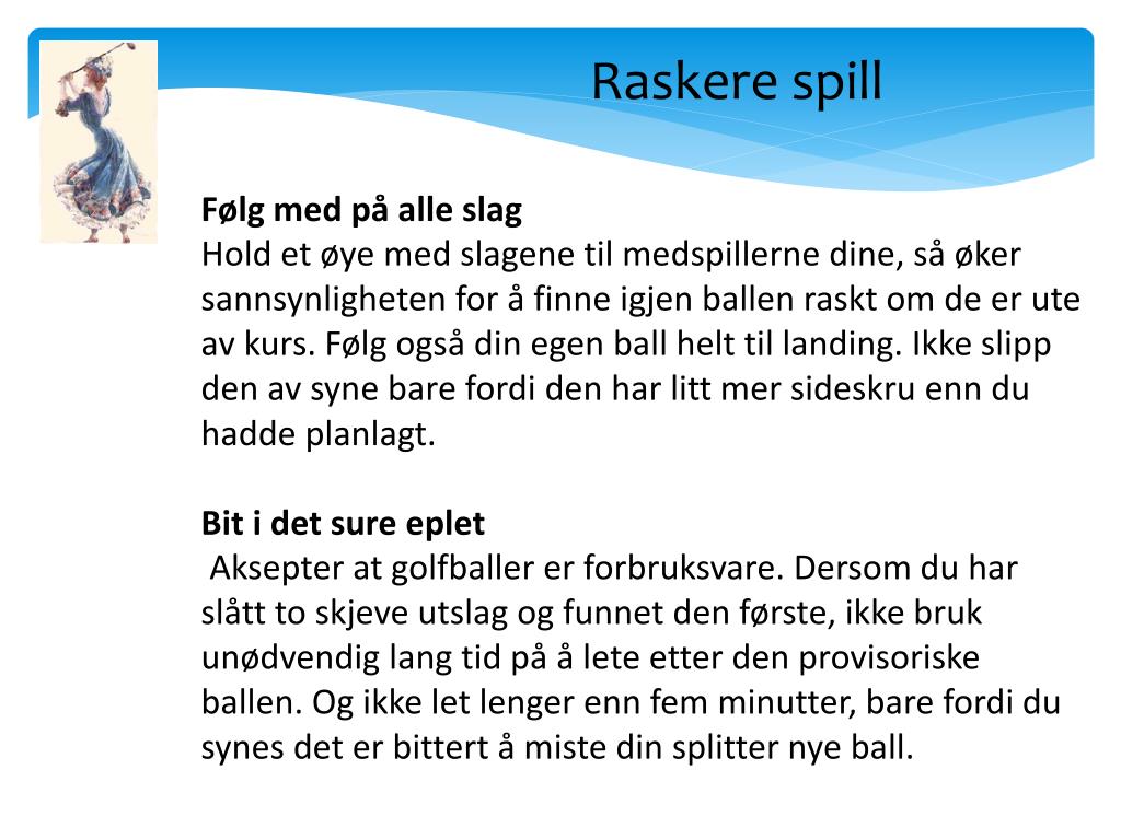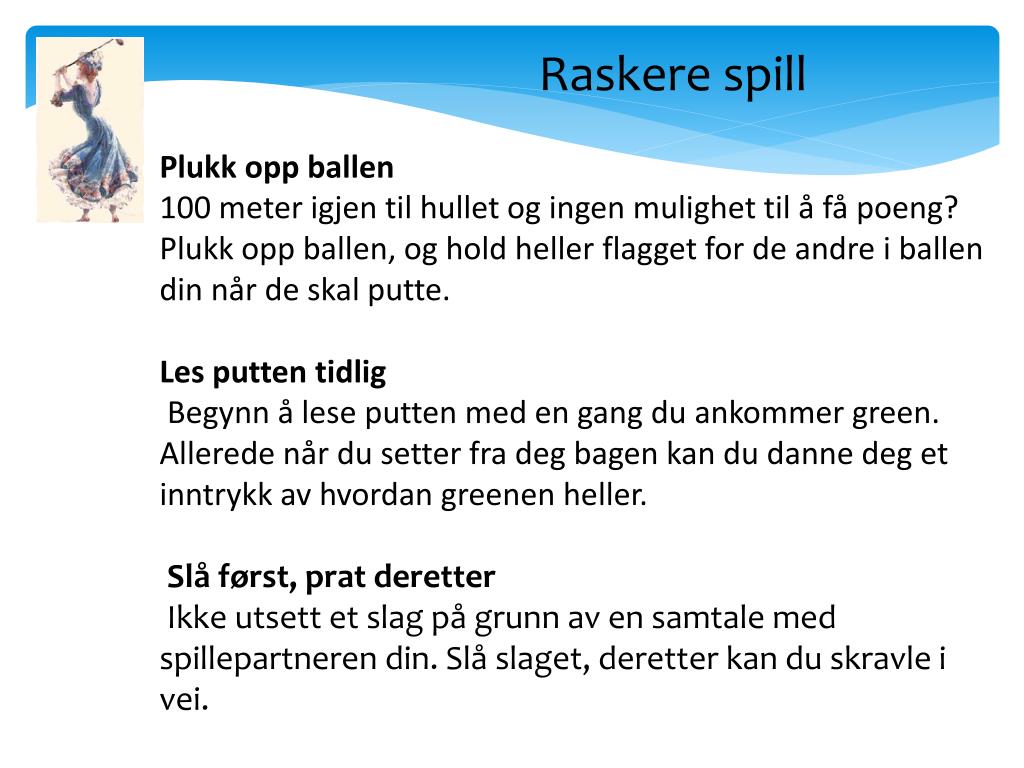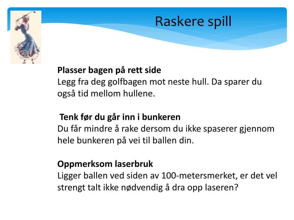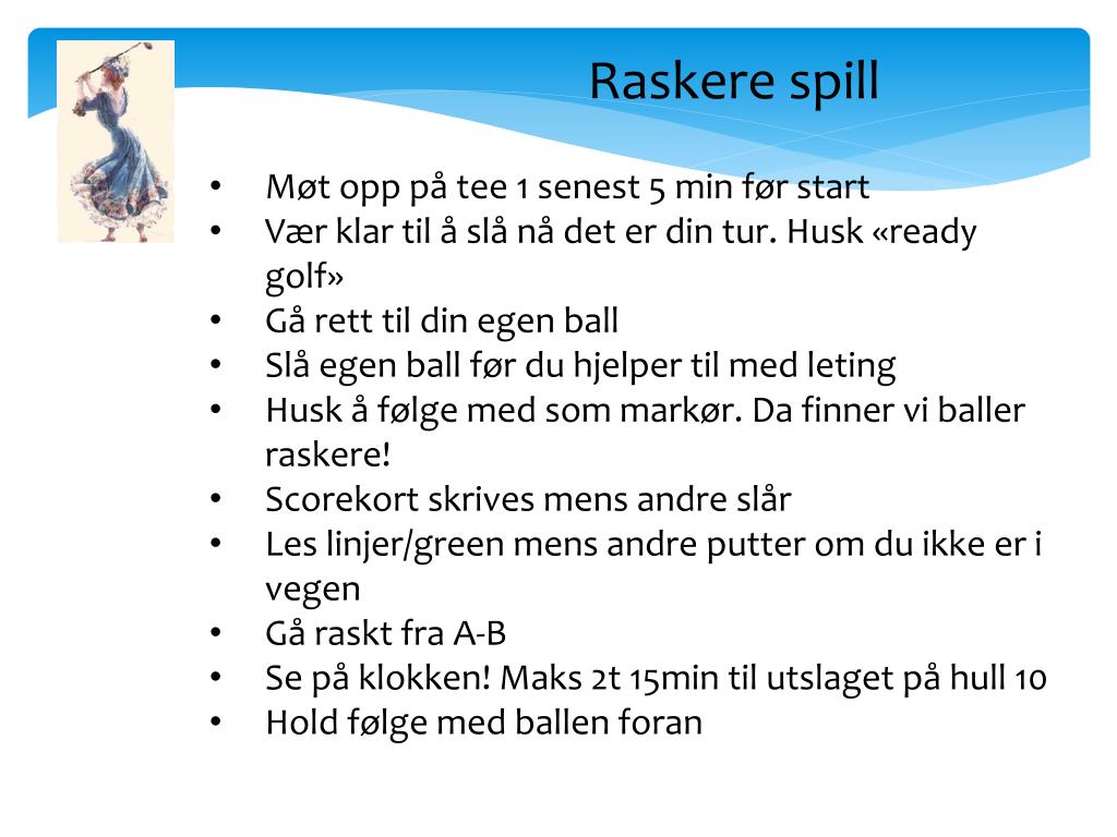 Raskere spill Kom deg vekk fra green Ikke bruk unødvendig lang tid på green. Kom dere raskt vekk fra greenområdet med en gang dere har hullet ut. Scorekortet fylles ut på neste tee eller på vei dit. Få en fast rutine Ikke frys over ballen eller ta unødvendig mange prøvesvinger. Vend deg til en fast rutine med maksimalt to prøvesvinger, så har du samme utgangspunkt før hvert slag. Slipp gjennom Dersom du leter etter ballen har du krav på fem minutter leting. Pass på at spillerne bak slipper gjennom mens du leter etter ballen din.