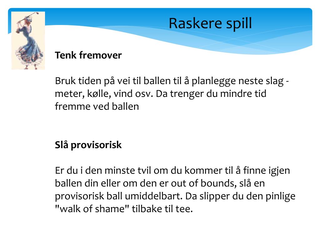 Raskere spill Tenk fremover Bruk tiden på vei til ballen til å planlegge neste slag - meter, kølle, vind osv. Da trenger du mindre tid fremme ved ballen Slå provisorisk Er du i den minste tvil om du kommer til å finne igjen ballen din eller om den er out of bounds, slå en provisorisk ball umiddelbart. Da slipper du den pinlige "walk of shame" tilbake til tee.