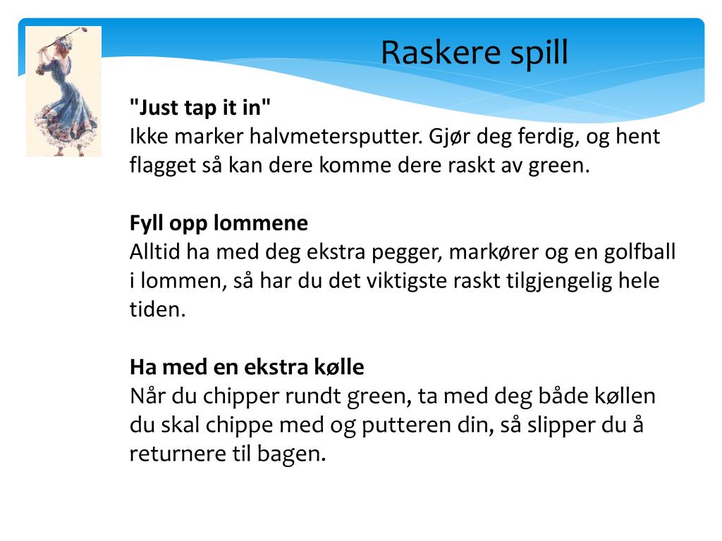 Raskere spill "Just tap it in" Ikke marker halvmetersputter. Gjør deg ferdig, og hent flagget så kan dere komme dere raskt av green. Fyll opp lommene Alltid ha med deg ekstra pegger, markører og en golfball i lommen, så har du det viktigste raskt tilgjengelig hele tiden. • Ha med en ekstra kølle • Når du chipper rundt green, ta med deg både køllen du skal chippe med og putteren din, så slipper du å returnere til bagen.