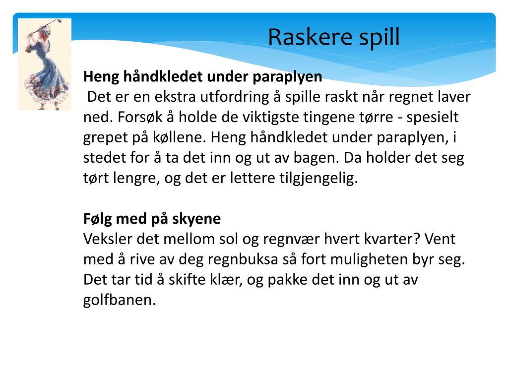 Raskere spill Heng håndkledet under paraplyen Det er en ekstra utfordring å spille raskt når regnet laver ned. Forsøk å holde de viktigste tingene tørre - spesielt grepet på køllene. Heng håndkledet under paraplyen, i stedet for å ta det inn og ut av bagen. Da holder det seg tørt lengre, og det er lettere tilgjengelig. • Følg med på skyene • Veksler det mellom sol og regnvær hvert kvarter? Vent med å rive av deg regnbuksa så fort muligheten byr seg. Det tar tid å skifte klær, og pakke det inn og ut av golfbanen.