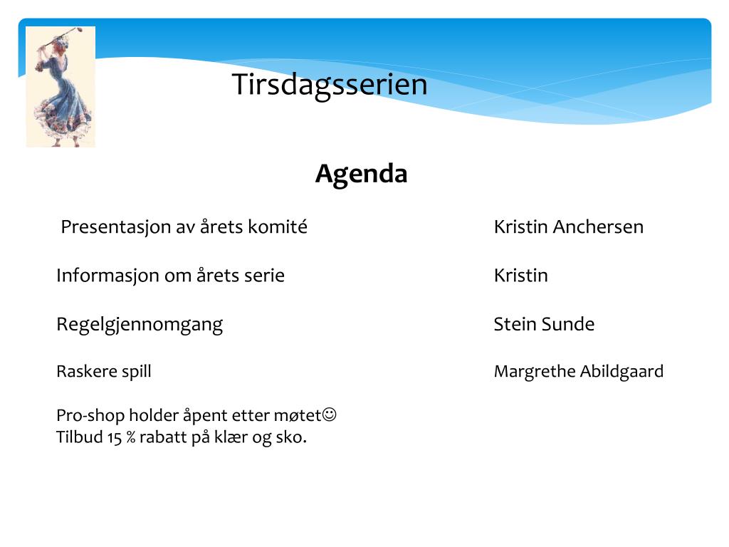 Tirsdagsserien Agenda Presentasjon av årets komité Kristin Anchersen Informasjon om årets serie Kristin Regelgjennomgang Stein Sunde Raskere spill Margrethe Abildgaard Pro-shop holder åpent etter møtet Tilbud 15 % rabatt på klær og sko.