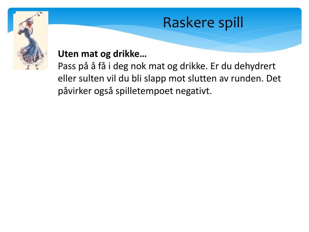 Raskere spill Uten mat og drikke… Pass på å få i deg nok mat og drikke. Er du dehydrert eller sulten vil du bli slapp mot slutten av runden. Det påvirker også spilletempoet negativt.