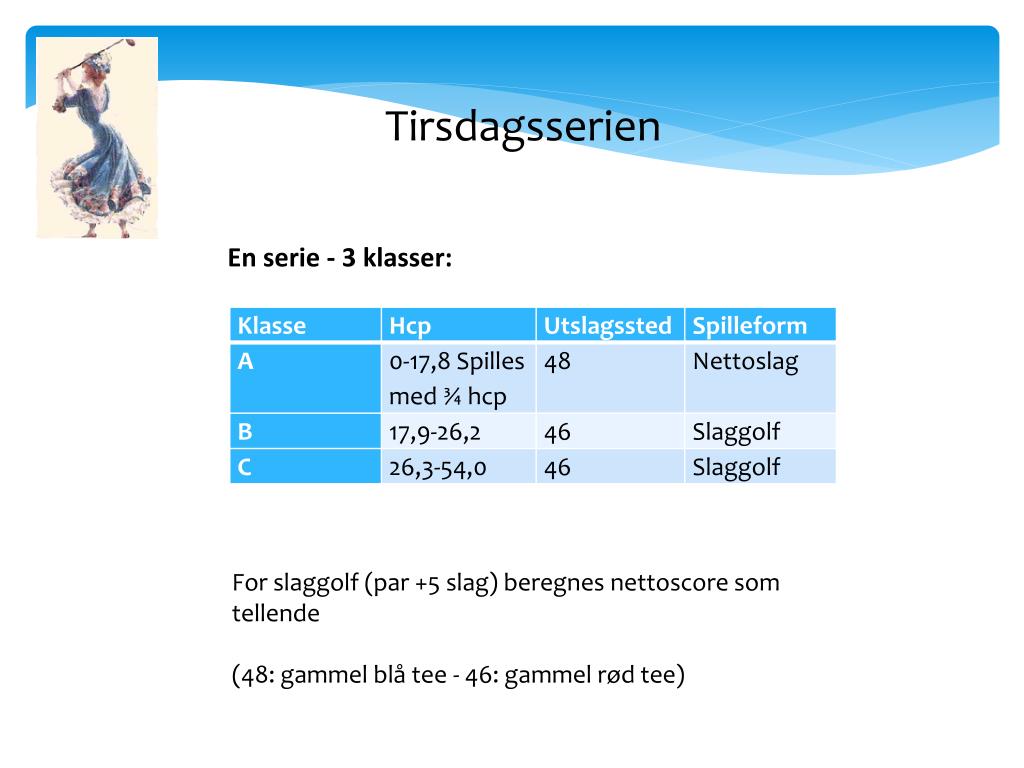 Tirsdagsserien En serie - 3 klasser: For slaggolf (par +5 slag) beregnes nettoscore som tellende (48: gammel blå tee - 46: gammel rød tee)