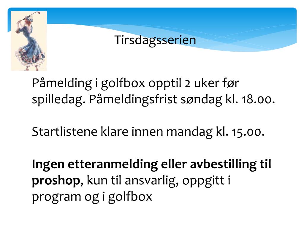 Tirsdagsserien Påmelding i golfbox opptil 2 uker før spilledag. Påmeldingsfrist søndag kl. 18.00. Startlistene klare innen mandag kl. 15.00. Ingen etteranmelding eller avbestilling til proshop, kun til ansvarlig, oppgitt i program og i golfbox