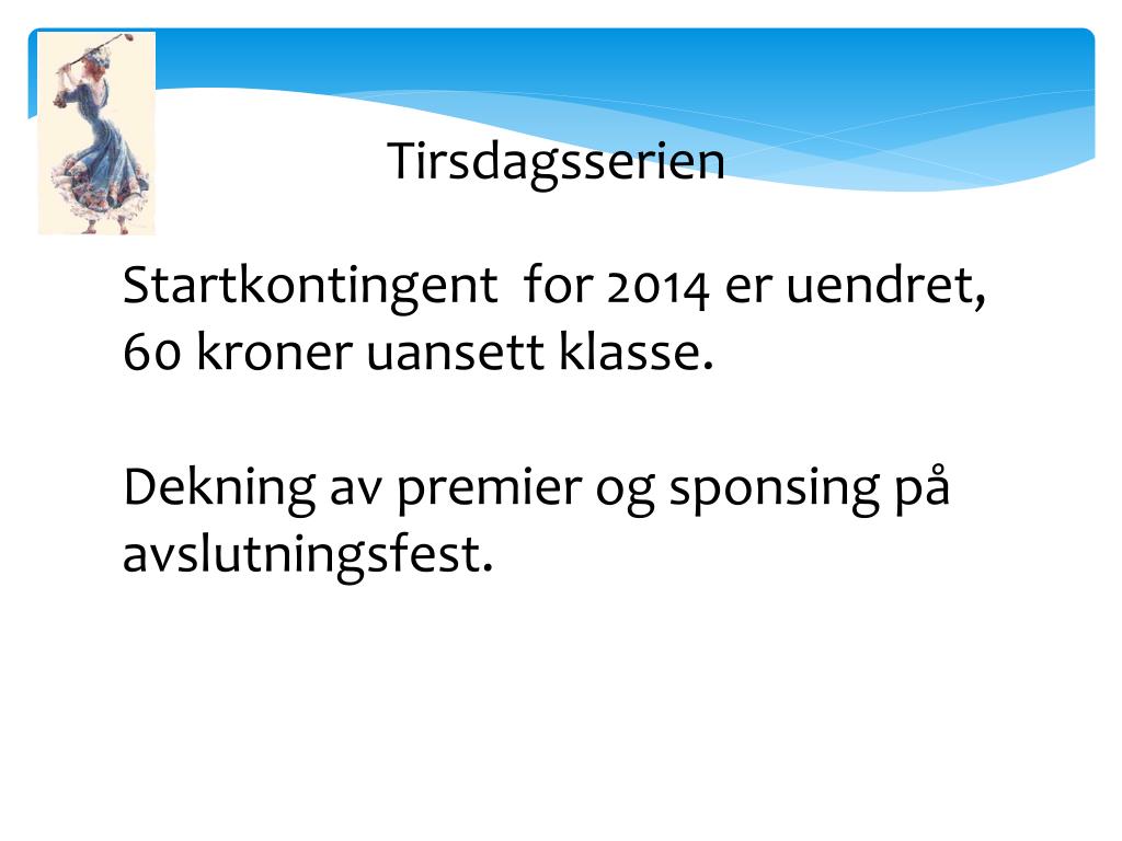 Tirsdagsserien Startkontingent for 2014 er uendret, 60 kroner uansett klasse. Dekning av premier og sponsing på avslutningsfest.