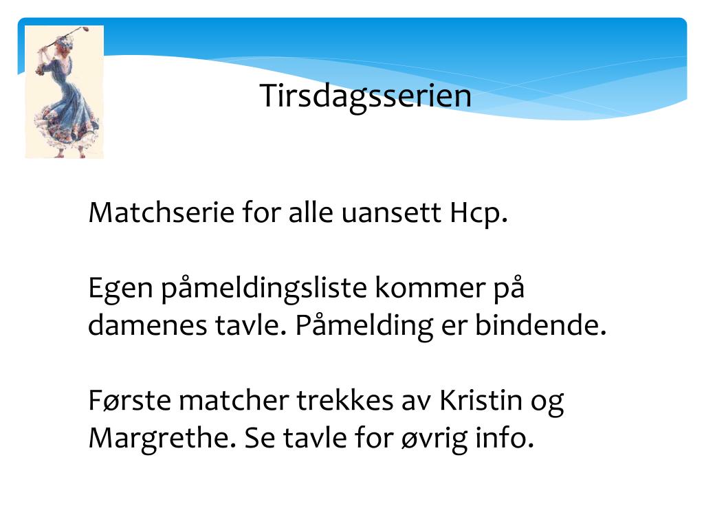 Tirsdagsserien Matchserie for alle uansett Hcp. Egen påmeldingsliste kommer på damenes tavle. Påmelding er bindende. Første matcher trekkes av Kristin og Margrethe. Se tavle for øvrig info.