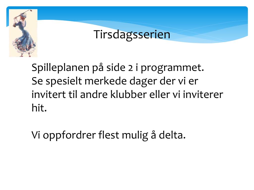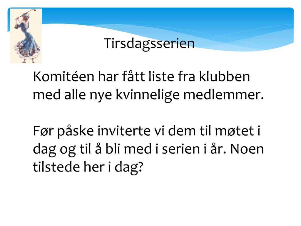 Tirsdagsserien Komitéen har fått liste fra klubben med alle nye kvinnelige medlemmer. Før påske inviterte vi dem til møtet i dag og til å bli med i serien i år. Noen tilstede her i dag?