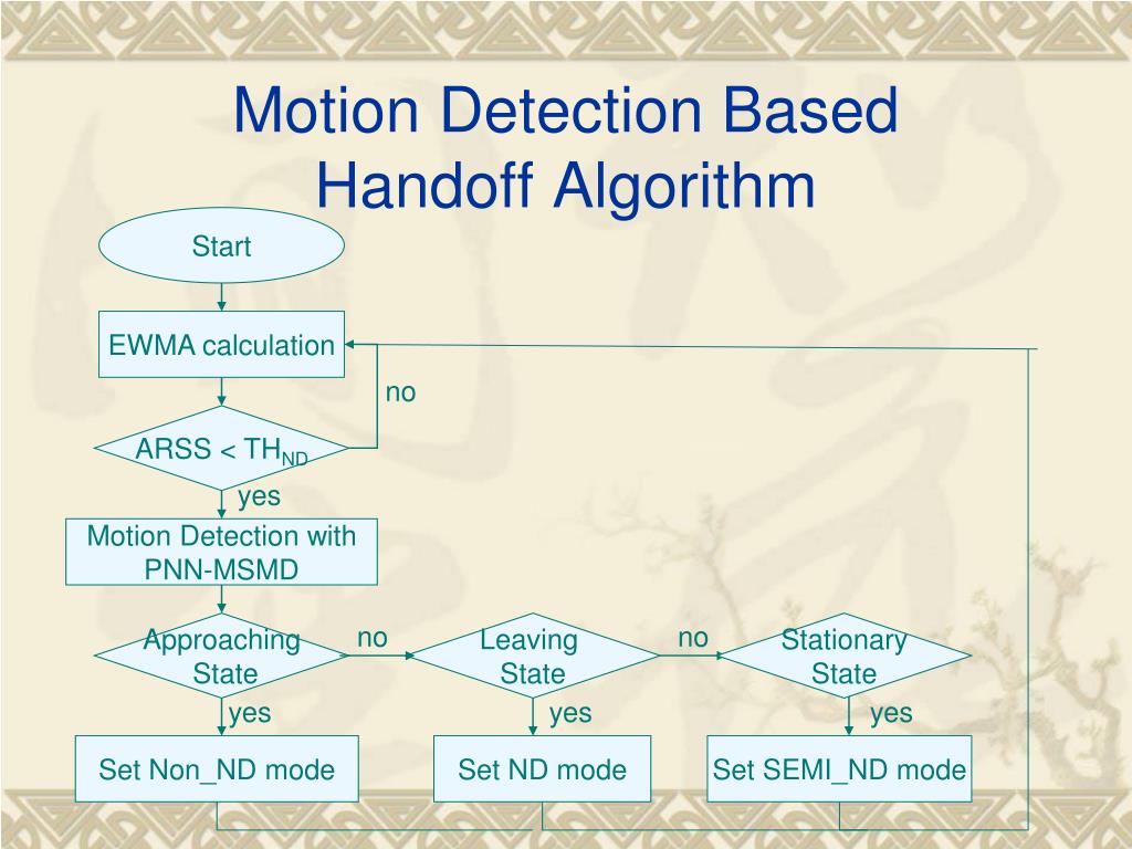 Motion Detection Based Handoff Algorithm Start EWMA calculation no ARSS < THND yes Motion Detection withPNN-MSMD Approaching State no Leaving State no StationaryState yes yes yes Set Non_ND mode Set ND mode Set SEMI_ND mode