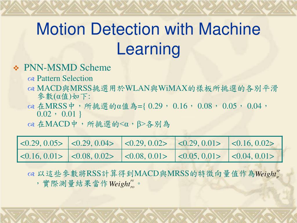Motion Detection with Machine Learning • PNN-MSMD Scheme • Pattern Selection • MACD與MRSS挑選用於WLAN與WiMAX的樣板所挑選的各別平滑參數(α值)如下: • 在MRSS中,所挑選的α值為={ 0.29, 0.16, 0.08, 0.05, 0.04, 0.02, 0.01 } • 在MACD中,所挑選的<α,β>各別為 • 以這些參數將RSS計算得到MACD與MRSS的特徵向量值作為 ,實際測量結果當作 。