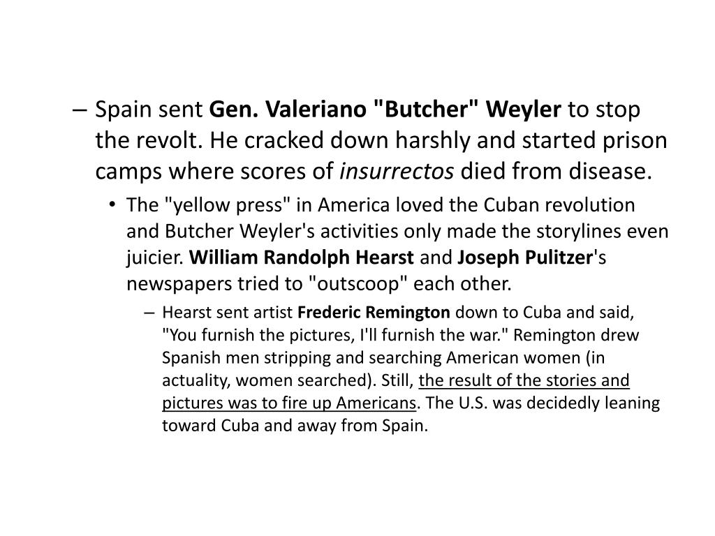 Spain sent Gen. Valeriano "Butcher" Weyler to stop the revolt. He cracked down harshly and started prison camps where scores of insurrectos died from disease. • The "yellow press" in America loved the Cuban revolution and Butcher Weyler's activities only made the storylines even juicier. William Randolph Hearst and Joseph Pulitzer's newspapers tried to "outscoop" each other. • Hearst sent artist Frederic Remington down to Cuba and said, "You furnish the pictures, I'll furnish the war." Remington drew Spanish men stripping and searching American women (in actuality, women searched). Still, the result of the stories and pictures was to fire up Americans. The U.S. was decidedly leaning toward Cuba and away from Spain.