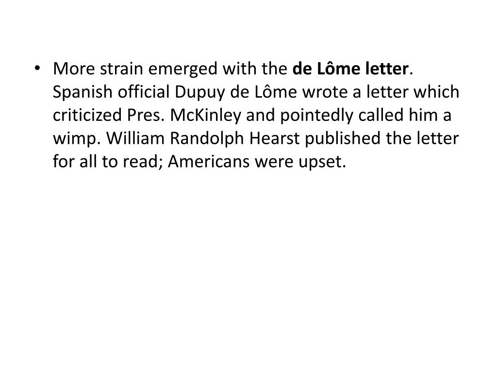 More strain emerged with the de Lôme letter. Spanish official Dupuy de Lôme wrote a letter which criticized Pres. McKinley and pointedly called him a wimp. William Randolph Hearst published the letter for all to read; Americans were upset.