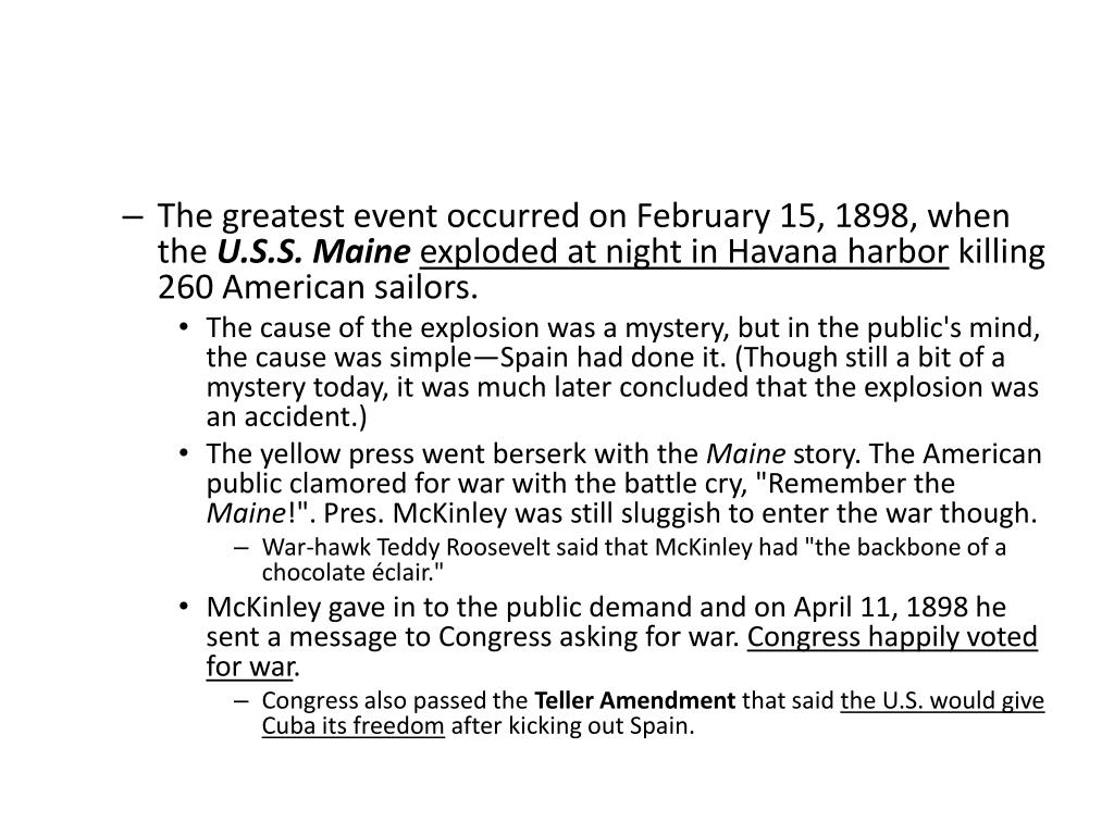 The greatest event occurred on February 15, 1898, when the U.S.S. Maineexploded at night in Havana harbor killing 260 American sailors. • The cause of the explosion was a mystery, but in the public's mind, the cause was simple—Spain had done it. (Though still a bit of a mystery today, it was much later concluded that the explosion was an accident.) • The yellow press went berserk with the Maine story. The American public clamored for war with the battle cry, "Remember the Maine!". Pres. McKinley was still sluggish to enter the war though. • War-hawk Teddy Roosevelt said that McKinley had "the backbone of a chocolate éclair." • McKinley gave in to the public demand and on April 11, 1898 he sent a message to Congress asking for war. Congress happily voted for war. • Congress also passed the Teller Amendment that said the U.S. would give Cuba its freedom after kicking out Spain.