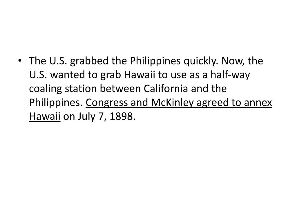 The U.S. grabbed the Philippines quickly. Now, the U.S. wanted to grab Hawaii to use as a half-way coaling station between California and the Philippines. Congress and McKinley agreed to annex Hawaii on July 7, 1898.