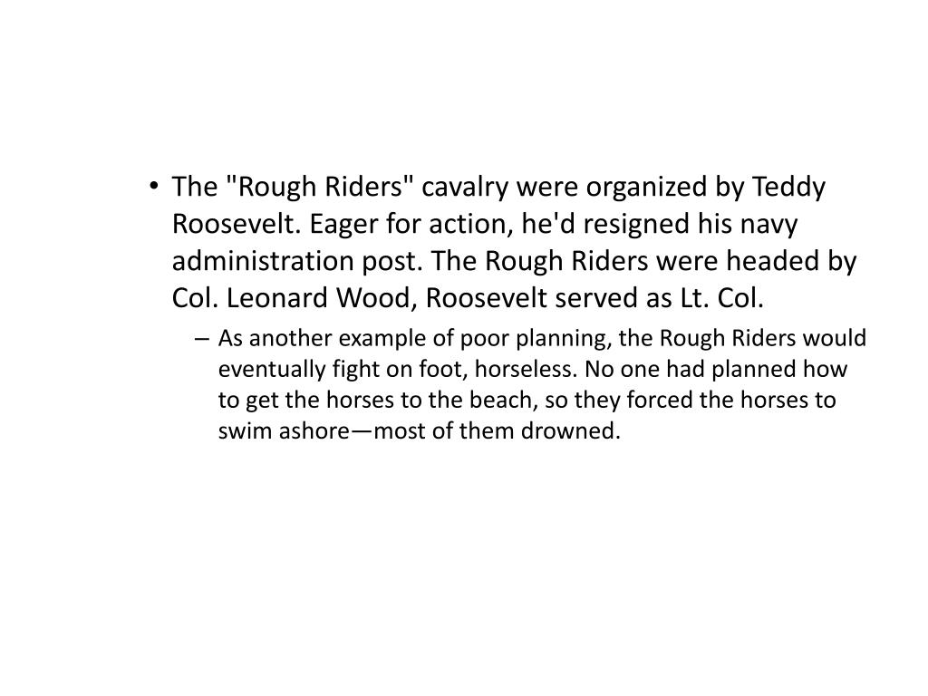 The "Rough Riders" cavalry were organized by Teddy Roosevelt. Eager for action, he'd resigned his navy administration post. The Rough Riders were headed by Col. Leonard Wood, Roosevelt served as Lt. Col. • As another example of poor planning, the Rough Riders would eventually fight on foot, horseless. No one had planned how to get the horses to the beach, so they forced the horses to swim ashore—most of them drowned.