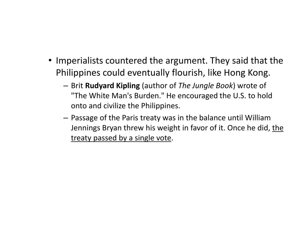 Imperialists countered the argument. They said that the Philippines could eventually flourish, like Hong Kong. • Brit Rudyard Kipling (author of The Jungle Book) wrote of "The White Man's Burden." He encouraged the U.S. to hold onto and civilize the Philippines. • Passage of the Paris treaty was in the balance until William Jennings Bryan threw his weight in favor of it. Once he did, the treaty passed by a single vote.