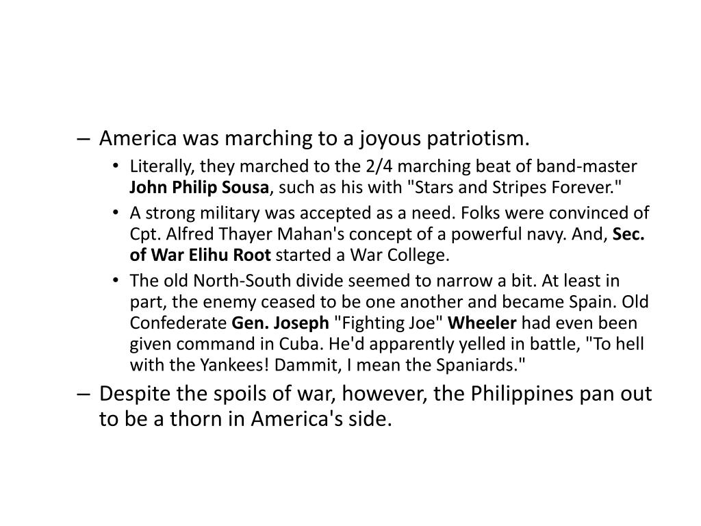 America was marching to a joyous patriotism. • Literally, they marched to the 2/4 marching beat of band-master John Philip Sousa, such as his with "Stars and Stripes Forever." • A strong military was accepted as a need. Folks were convinced of Cpt. Alfred Thayer Mahan's concept of a powerful navy. And, Sec. of War Elihu Root started a War College. • The old North-South divide seemed to narrow a bit. At least in part, the enemy ceased to be one another and became Spain. Old Confederate Gen. Joseph "Fighting Joe" Wheeler had even been given command in Cuba. He'd apparently yelled in battle, "To hell with the Yankees! Dammit, I mean the Spaniards." • Despite the spoils of war, however, the Philippines pan out to be a thorn in America's side.