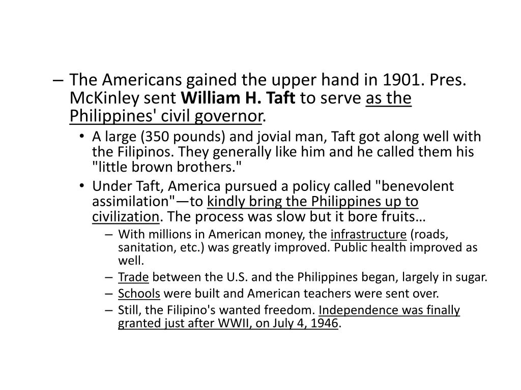 The Americans gained the upper hand in 1901. Pres. McKinley sent William H. Taft to serve as the Philippines' civil governor. • A large (350 pounds) and jovial man, Taft got along well with the Filipinos. They generally like him and he called them his "little brown brothers." • Under Taft, America pursued a policy called "benevolent assimilation"—to kindly bring the Philippines up to civilization. The process was slow but it bore fruits… • With millions in American money, the infrastructure (roads, sanitation, etc.) was greatly improved. Public health improved as well. • Trade between the U.S. and the Philippines began, largely in sugar. • Schools were built and American teachers were sent over. • Still, the Filipino's wanted freedom. Independence was finally granted just after WWII, on July 4, 1946.