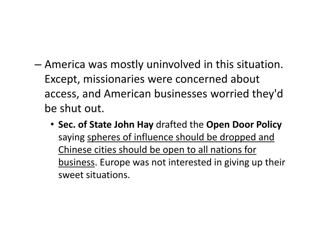 America was mostly uninvolved in this situation. Except, missionaries were concerned about access, and American businesses worried they'd be shut out. • Sec. of State John Hay drafted the Open Door Policy saying spheres of influence should be dropped and Chinese cities should be open to all nations for business. Europe was not interested in giving up their sweet situations.