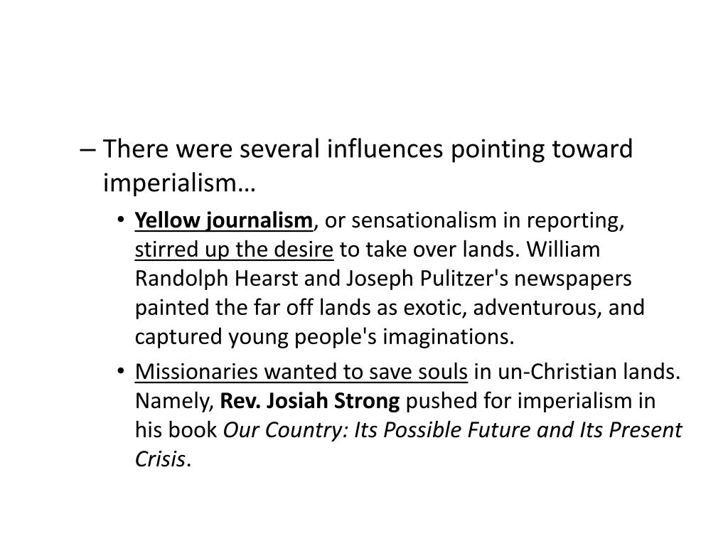 There were several influences pointing toward imperialism… • Yellow journalism, or sensationalism in reporting, stirred up the desire to take over lands. William Randolph Hearst and Joseph Pulitzer's newspapers painted the far off lands as exotic, adventurous, and captured young people's imaginations. • Missionaries wanted to save souls in un-Christian lands. Namely, Rev. Josiah Strong pushed for imperialism in his book Our Country: Its Possible Future and Its Present Crisis.