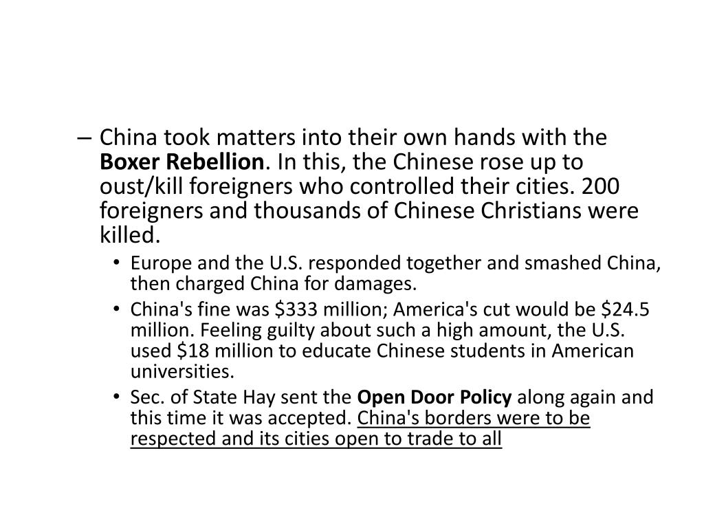 China took matters into their own hands with the Boxer Rebellion. In this, the Chinese rose up to oust/kill foreigners who controlled their cities. 200 foreigners and thousands of Chinese Christians were killed. • Europe and the U.S. responded together and smashed China, then charged China for damages. • China's fine was $333 million; America's cut would be $24.5 million. Feeling guilty about such a high amount, the U.S. used $18 million to educate Chinese students in American universities. • Sec. of State Hay sent the Open Door Policy along again and this time it was accepted. China's borders were to be respected and its cities open to trade to all