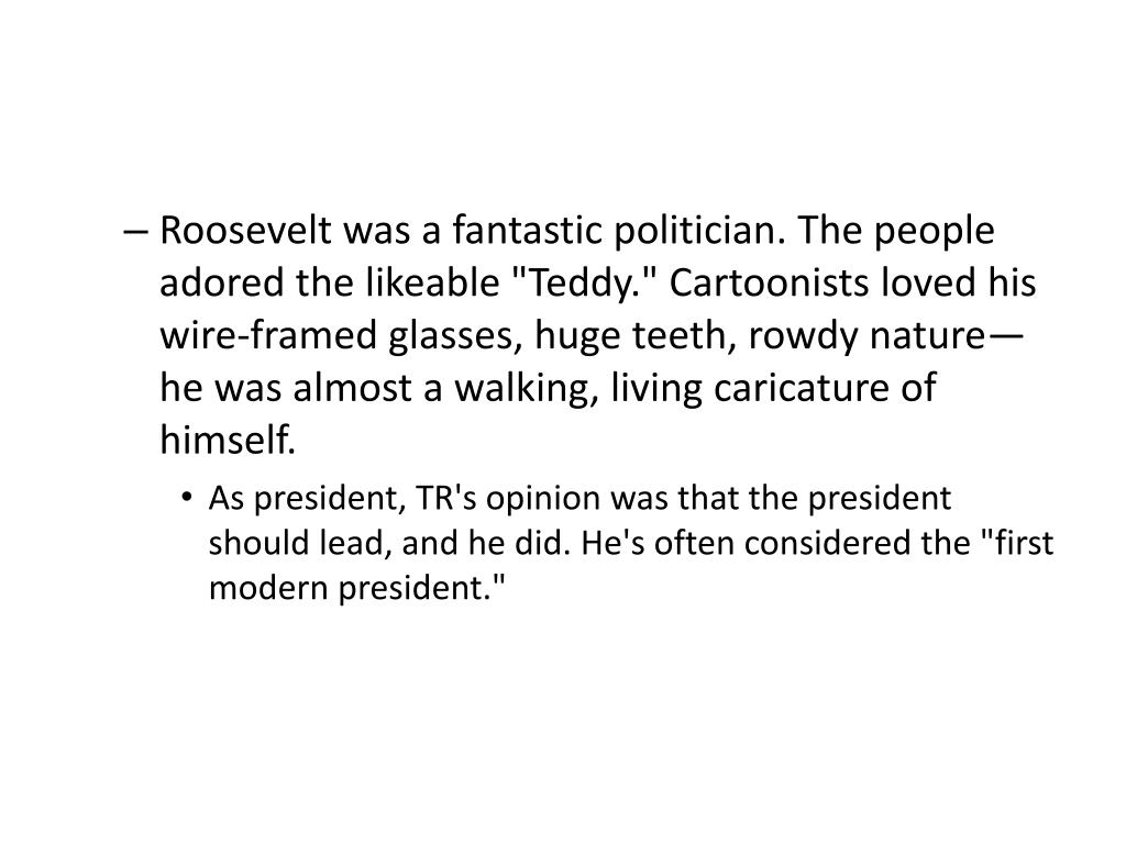 Roosevelt was a fantastic politician. The people adored the likeable "Teddy." Cartoonists loved his wire-framed glasses, huge teeth, rowdy nature—he was almost a walking, living caricature of himself. • As president, TR's opinion was that the president should lead, and he did. He's often considered the "first modern president."