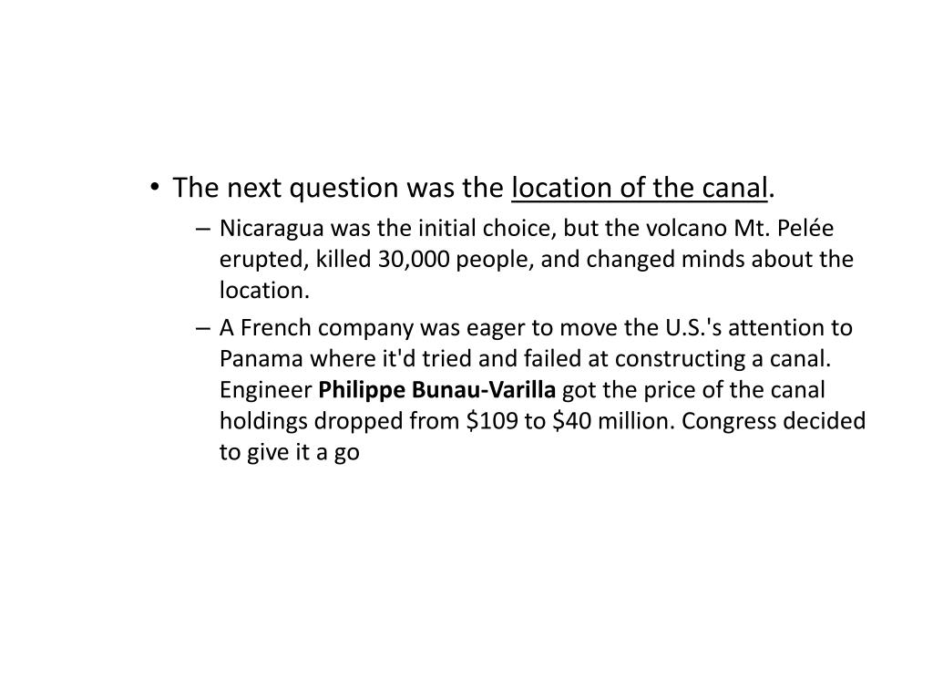 The next question was the location of the canal. • Nicaragua was the initial choice, but the volcano Mt. Pelée erupted, killed 30,000 people, and changed minds about the location. • A French company was eager to move the U.S.'s attention to Panama where it'd tried and failed at constructing a canal. Engineer Philippe Bunau-Varilla got the price of the canal holdings dropped from $109 to $40 million. Congress decided to give it a go