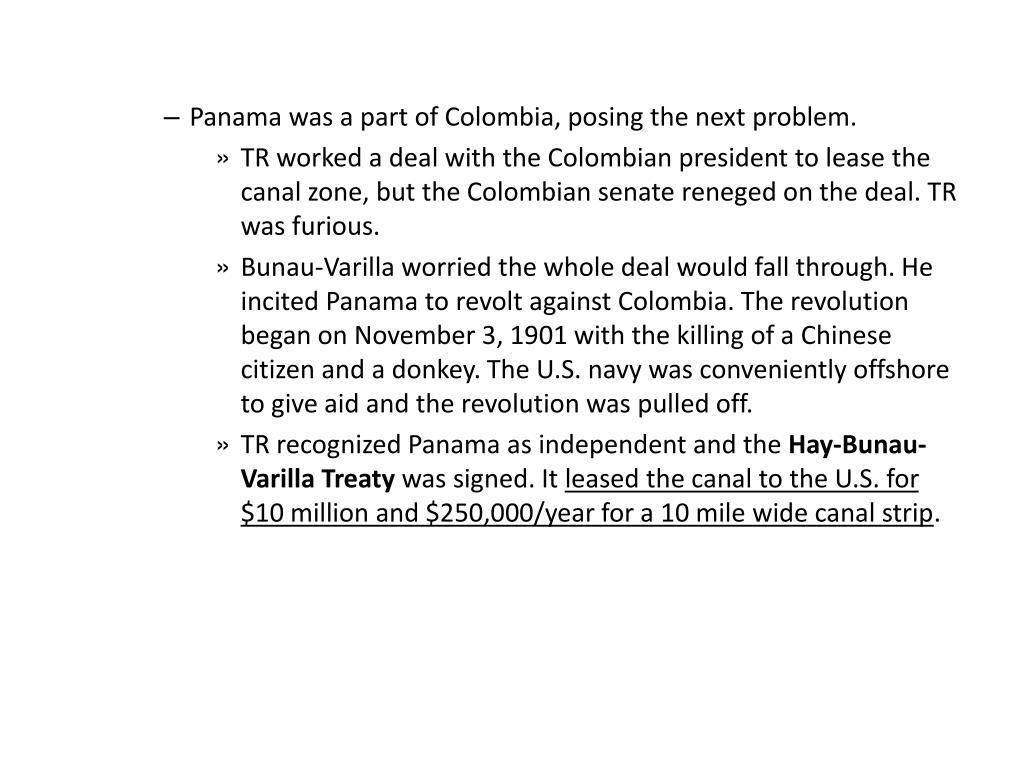 Panama was a part of Colombia, posing the next problem. • TR worked a deal with the Colombian president to lease the canal zone, but the Colombian senate reneged on the deal. TR was furious. • Bunau-Varilla worried the whole deal would fall through. He incited Panama to revolt against Colombia. The revolution began on November 3, 1901 with the killing of a Chinese citizen and a donkey. The U.S. navy was conveniently offshore to give aid and the revolution was pulled off. • TR recognized Panama as independent and the Hay-Bunau-Varilla Treaty was signed. It leased the canal to the U.S. for $10 million and $250,000/year for a 10 mile wide canal strip.