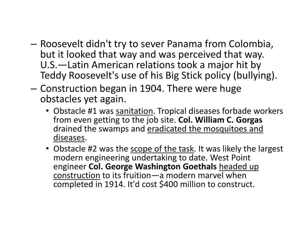 Roosevelt didn't try to sever Panama from Colombia, but it looked that way and was perceived that way. U.S.—Latin American relations took a major hit by Teddy Roosevelt's use of his Big Stick policy (bullying). • Construction began in 1904. There were huge obstacles yet again. • Obstacle #1 was sanitation. Tropical diseases forbade workers from even getting to the job site. Col. William C. Gorgas drained the swamps and eradicated the mosquitoes and diseases. • Obstacle #2 was the scope of the task. It was likely the largest modern engineering undertaking to date. West Point engineer Col. George Washington Goethalsheaded up construction to its fruition—a modern marvel when completed in 1914. It'd cost $400 million to construct.