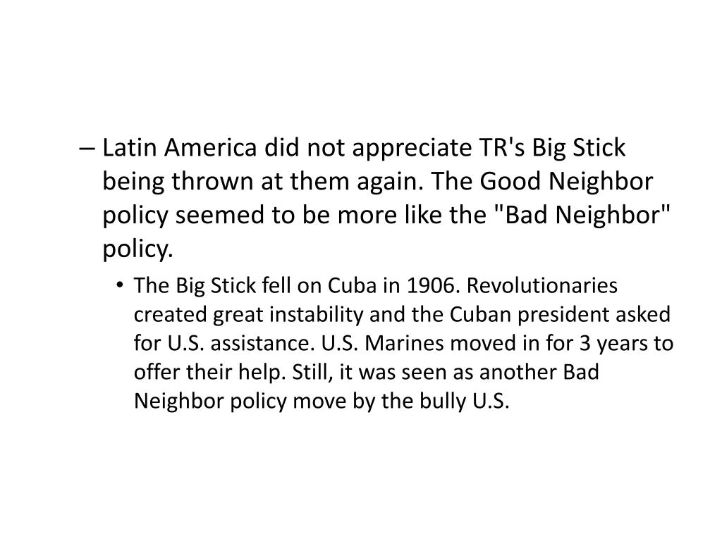 Latin America did not appreciate TR's Big Stick being thrown at them again. The Good Neighbor policy seemed to be more like the "Bad Neighbor" policy. • The Big Stick fell on Cuba in 1906. Revolutionaries created great instability and the Cuban president asked for U.S. assistance. U.S. Marines moved in for 3 years to offer their help. Still, it was seen as another Bad Neighbor policy move by the bully U.S.