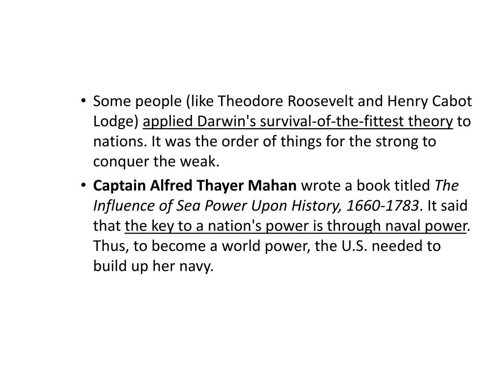 Some people (like Theodore Roosevelt and Henry Cabot Lodge) applied Darwin's survival-of-the-fittest theory to nations. It was the order of things for the strong to conquer the weak. • Captain Alfred Thayer Mahan wrote a book titled The Influence of Sea Power Upon History, 1660-1783. It said that the key to a nation's power is through naval power. Thus, to become a world power, the U.S. needed to build up her navy.