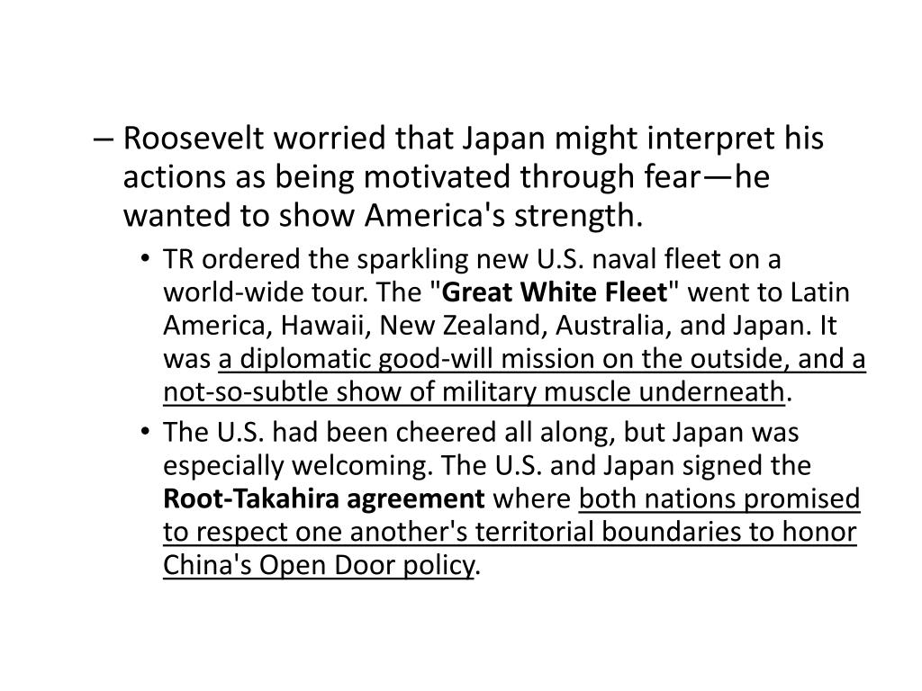 Roosevelt worried that Japan might interpret his actions as being motivated through fear—he wanted to show America's strength. • TR ordered the sparkling new U.S. naval fleet on a world-wide tour. The "Great White Fleet" went to Latin America, Hawaii, New Zealand, Australia, and Japan. It was a diplomatic good-will mission on the outside, and a not-so-subtle show of military muscle underneath. • The U.S. had been cheered all along, but Japan was especially welcoming. The U.S. and Japan signed the Root-Takahira agreement where both nations promised to respect one another's territorial boundaries to honor China's Open Door policy.