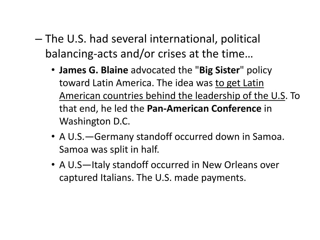 The U.S. had several international, political balancing-acts and/or crises at the time… • James G. Blaine advocated the "Big Sister" policy toward Latin America. The idea was to get Latin American countries behind the leadership of the U.S. To that end, he led the Pan-American Conference in Washington D.C. • A U.S.—Germany standoff occurred down in Samoa. Samoa was split in half. • A U.S—Italy standoff occurred in New Orleans over captured Italians. The U.S. made payments.