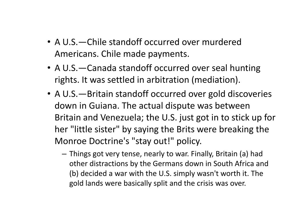 A U.S.—Chile standoff occurred over murdered Americans. Chile made payments. • A U.S.—Canada standoff occurred over seal hunting rights. It was settled in arbitration (mediation). • A U.S.—Britain standoff occurred over gold discoveries down in Guiana. The actual dispute was between Britain and Venezuela; the U.S. just got in to stick up for her "little sister" by saying the Brits were breaking the Monroe Doctrine's "stay out!" policy. • Things got very tense, nearly to war. Finally, Britain (a) had other distractions by the Germans down in South Africa and (b) decided a war with the U.S. simply wasn't worth it. The gold lands were basically split and the crisis was over.