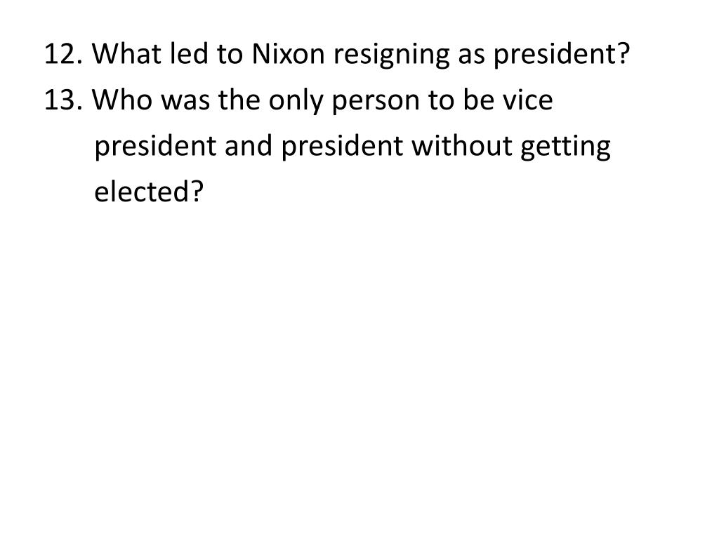 12. What led to Nixon resigning as president? 13. Who was the only person to be vice president and president without getting elected?