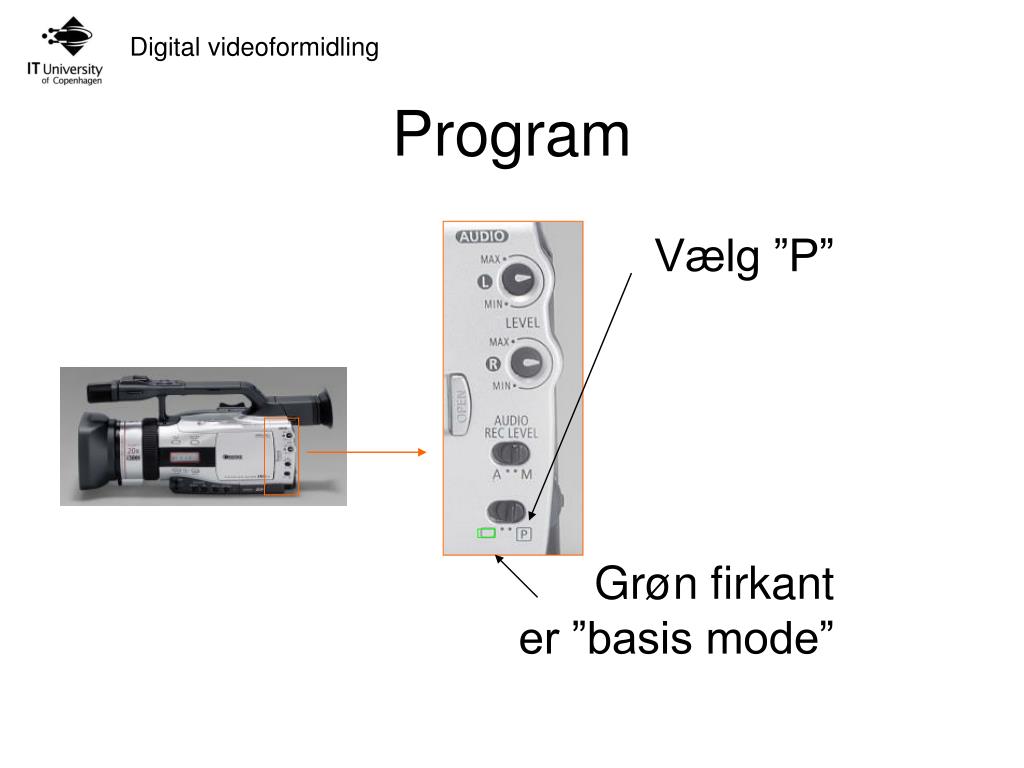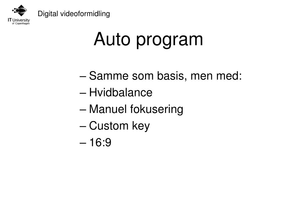 Auto program • Samme som basis, men med: • Hvidbalance • Manuel fokusering • Custom key • 16:9