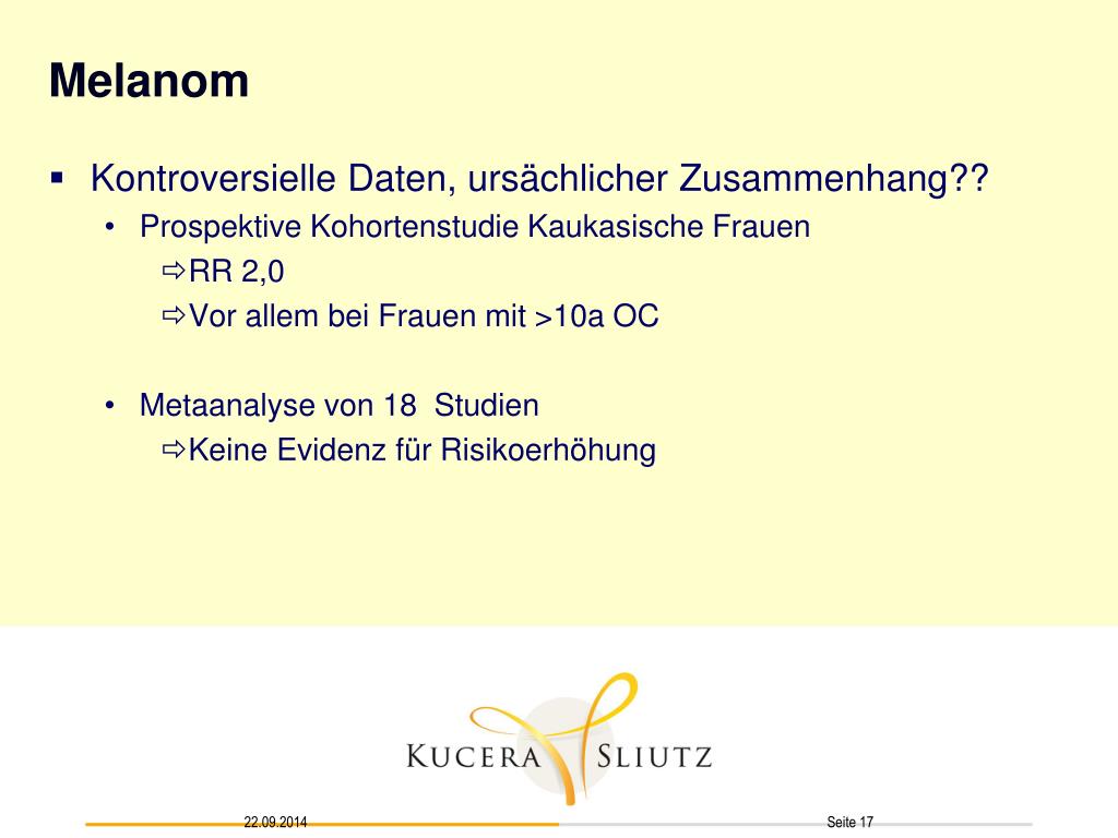 Melanom • Kontroversielle Daten, ursächlicher Zusammenhang?? • Prospektive Kohortenstudie Kaukasische Frauen • RR 2,0 • Vor allem bei Frauen mit >10a OC • Metaanalyse von 18 Studien • Keine Evidenz für Risikoerhöhung