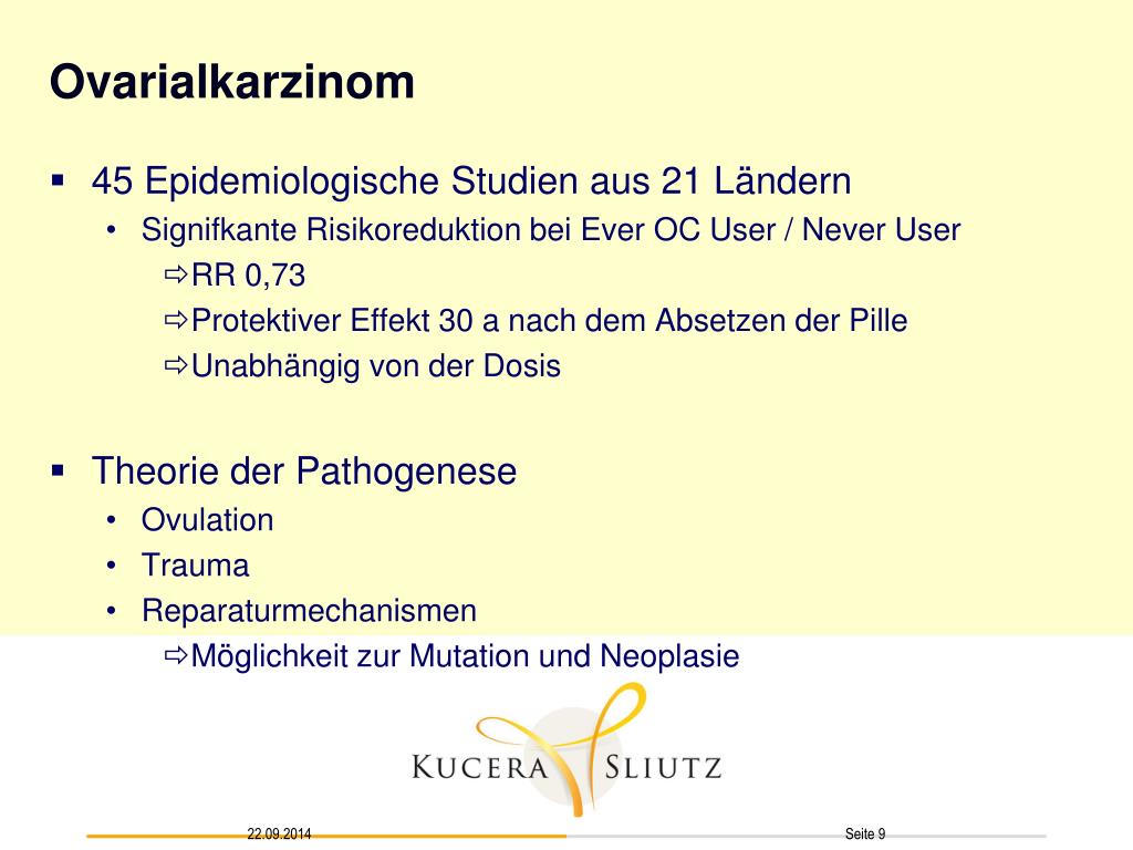 Ovarialkarzinom • 45 Epidemiologische Studien aus 21 Ländern • Signifkante Risikoreduktion bei Ever OC User / Never User • RR 0,73 • Protektiver Effekt 30 a nach dem Absetzen der Pille • Unabhängig von der Dosis • Theorie der Pathogenese • Ovulation • Trauma • Reparaturmechanismen • Möglichkeit zur Mutation und Neoplasie