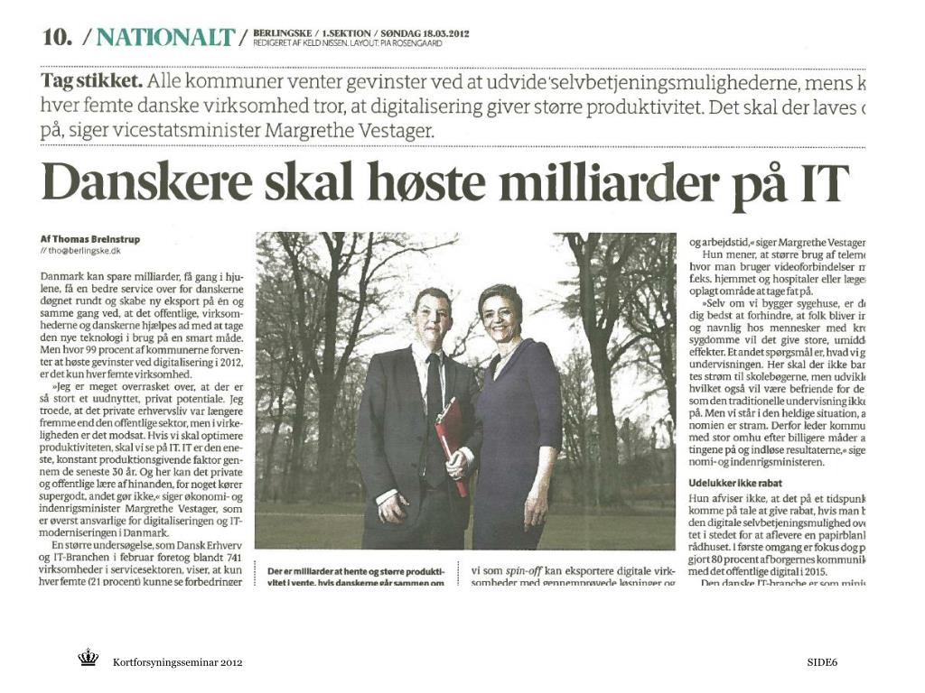 Danskerne skal høste milliarder på IT • Stort potentiale i den offentlige sektor • KÆMPE potentiale i den private sektor • ”Det handler om at levere digitalt i stedet for analogt” (der er altid åbent) • Det offentlige skal både skubbe og trække • ”Den offentlige satsning på digitalisering kan vi også bruge i den private sektor”, siger Morten Bangsgaard, administrerende direktør i IT –Branchen: • ”Uanset om vi taler den offentlige eller private sektor, er der betydelig mulighed for at øge produktiviteten, styrke den danske konkurrenceevne og dermed få skabt væksten” Kortforsyningsseminar 2012