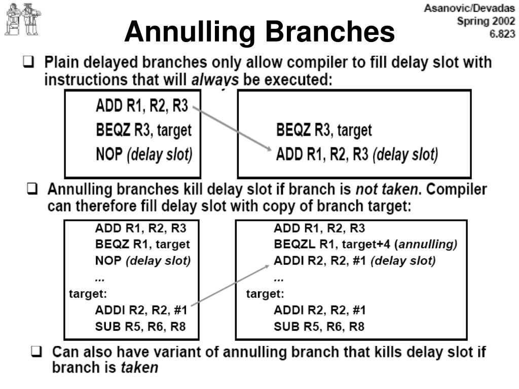 Conditional Branches: solution 3Delayed Branches Change the semantics of branches and jumps ⇒ Instruction after branch always executed, regardless if branch taken or not taken. Need not kill any instructions !