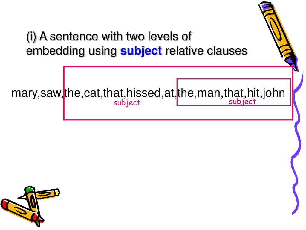 (ii) A sentence with two levels of embedding using one subject and one object relative clause mary,saw,the,cat,that,hissed,at,the,man,that,john,hit subject object object subject mary,saw,the,man,that,the,cat,that,hit,hohn,hissed,at