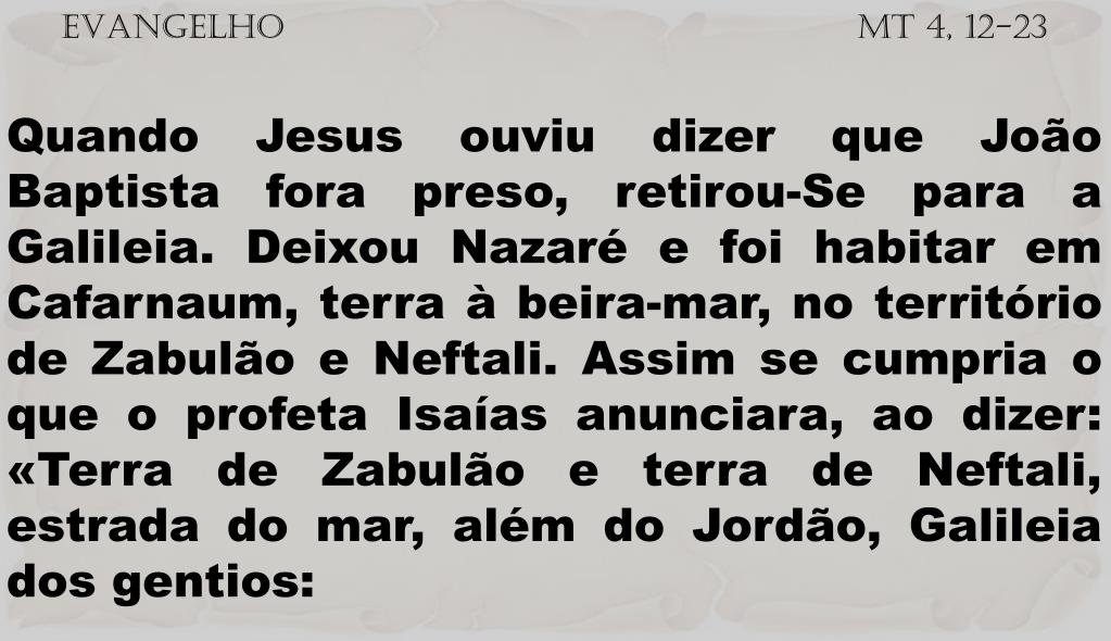 EVANGELHO Mt 4, 12-23 Quando Jesus ouviu dizer que João Baptista fora preso, retirou-Se para a Galileia. Deixou Nazaré e foi habitar em Cafarnaum, terra à beira-mar, no território de Zabulão e Neftali. Assim se cumpria o que o profeta Isaías anunciara, ao dizer: «Terra de Zabulão e terra de Neftali, estrada do mar, além do Jordão, Galileia dos gentios: