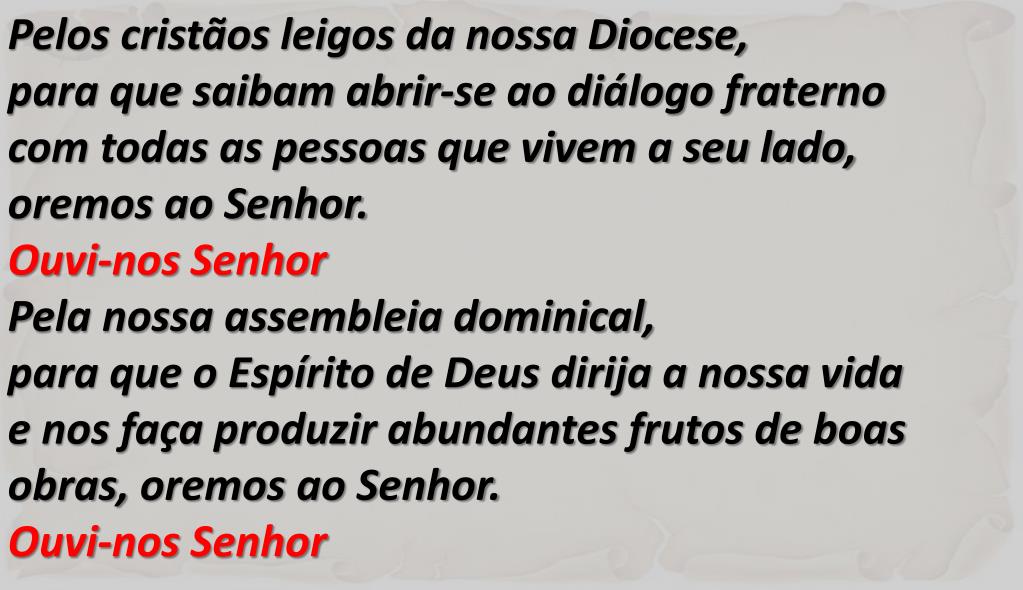 Pelos cristãos leigos da nossa Diocese, • para que saibam abrir-se ao diálogo fraterno • com todas as pessoas que vivem a seu lado, • oremos ao Senhor. • Ouvi-nos Senhor • Pela nossa assembleia dominical, • para que o Espírito de Deus dirija a nossa vida • e nos faça produzir abundantes frutos de boas obras, oremos ao Senhor. • Ouvi-nos Senhor