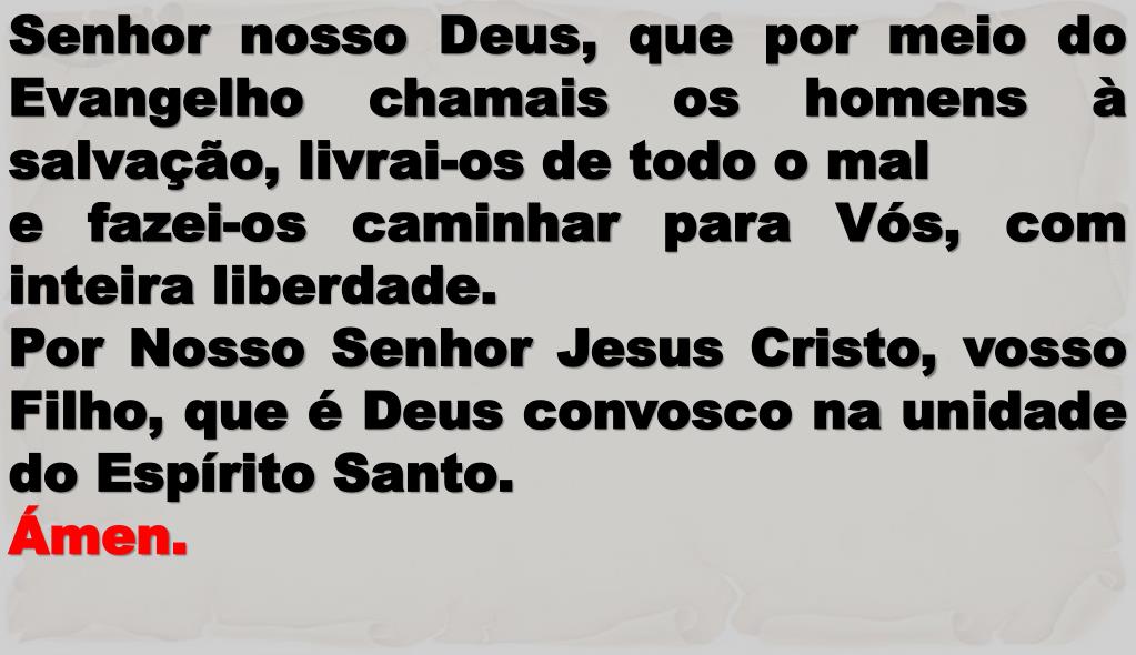 Senhor nosso Deus, que por meio do Evangelho chamais os homens à salvação, livrai-os de todo o mal e fazei-os caminhar para Vós, com inteira liberdade. Por Nosso Senhor Jesus Cristo, vosso Filho, que é Deus convosco na unidade do Espírito Santo. Ámen.