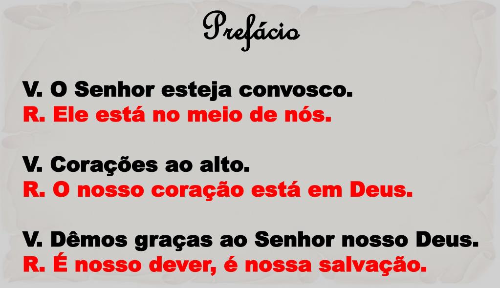 Prefácio • V. O Senhor esteja convosco. • R. Ele está no meio de nós. • V. Corações ao alto. • R. O nosso coração está em Deus. • V. Dêmos graças ao Senhor nosso Deus. • R. É nosso dever, é nossa salvação.